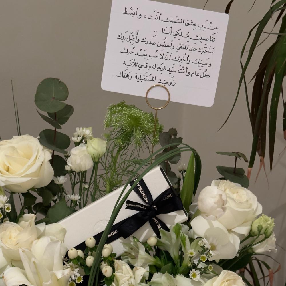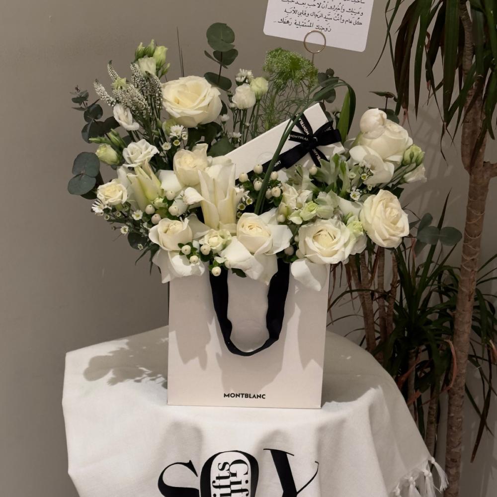 كبك مون بلان الفاخر منسق بباقة زهور بيضاء أنيقة يقدم كهدية مميزة. تداخل بين الفخامة والرقي مع لمسة طبيعية ساحرة، مثالي للمناسبات الخاصة.