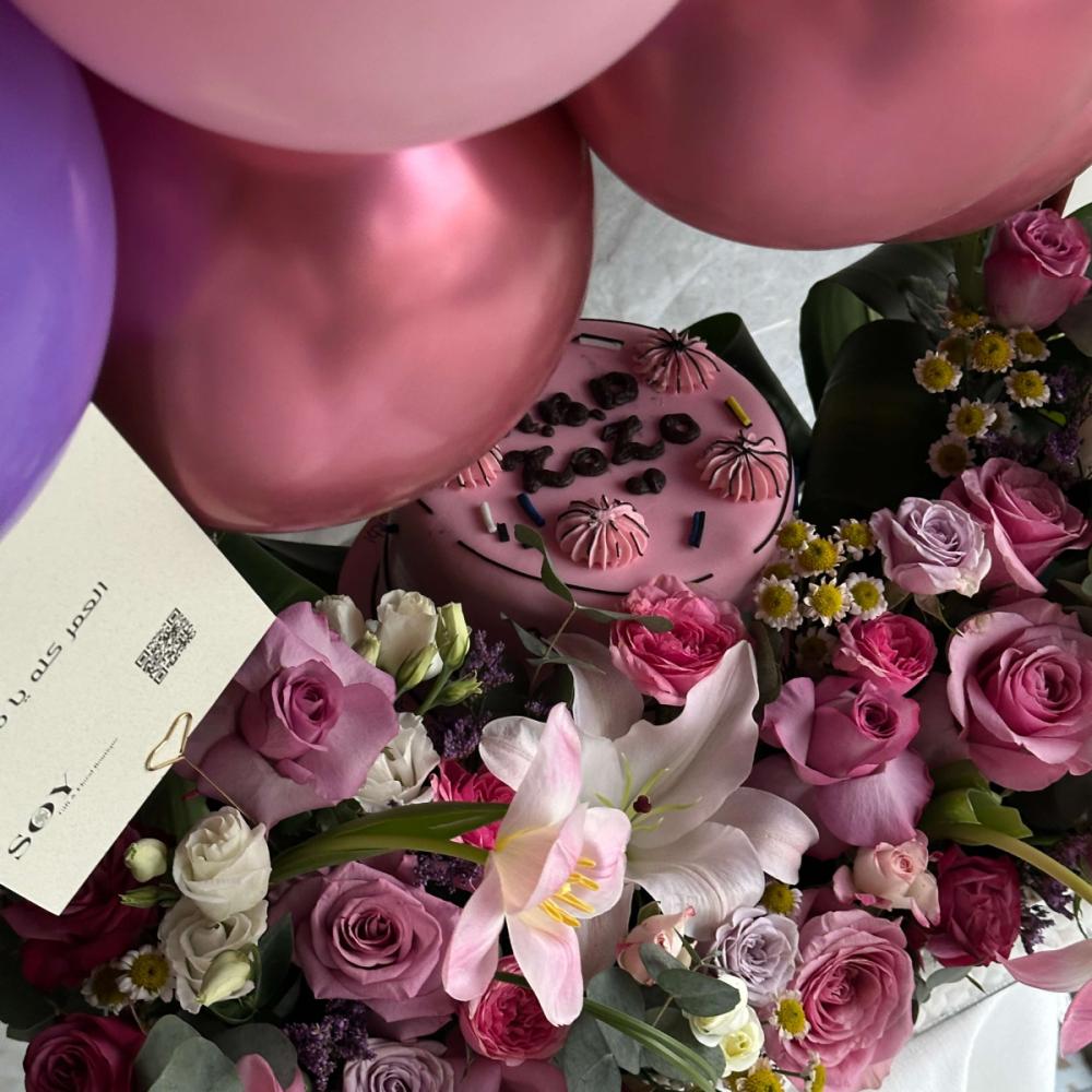 تنسيق الغيمة مع البالونات مع كعكة بتصميم مميز تكفي 8 أشخاص ، مرفق بتنسيق زهور أنيق. مزيج مثالي للاحتفالات الخاصة والمناسبات السعيدة، يضفي لمسة من الجمال والفرح.