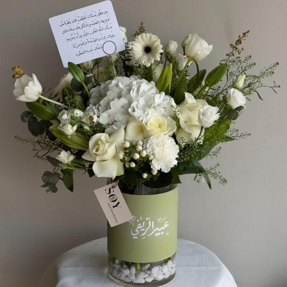 تُضفي هذه الفازة بلمساتها الأنيقة لمسة ساحرة لأي مناسبة خاصة حيث تأتي مزينة بمزيج من الأزهار البيضاء مثل الورود، والزنابق، وربما زهور الهيدرانجيا. هذه التشكيلة الزهرية تتجلى بروعة داخل فازة شفافة تملؤها الأحجار البيضاء الزخرفية، وتغلفها شريط أخضر مزين بنقوش بيضاء عربية، مما يضفي عليها لمسة ثقافية وفنية رفيعة.