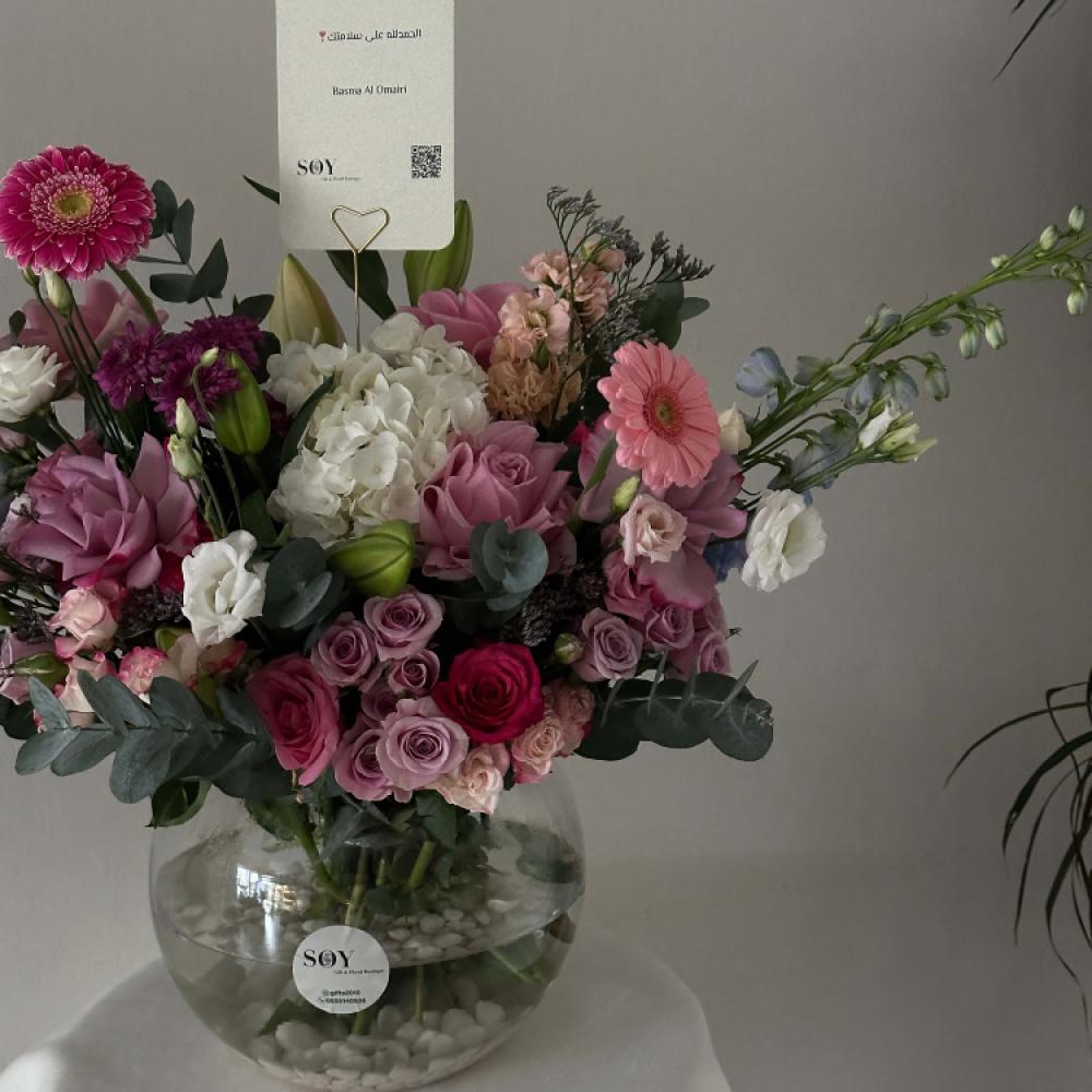 تنسيق زهور فاخر همسة الربيع في فازة زجاجية – هدية أنيقة من SOY Gifts