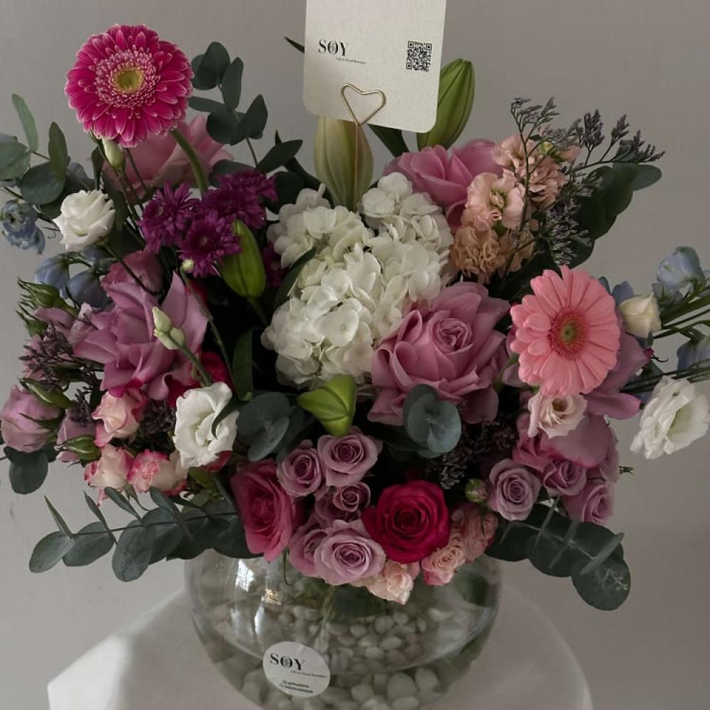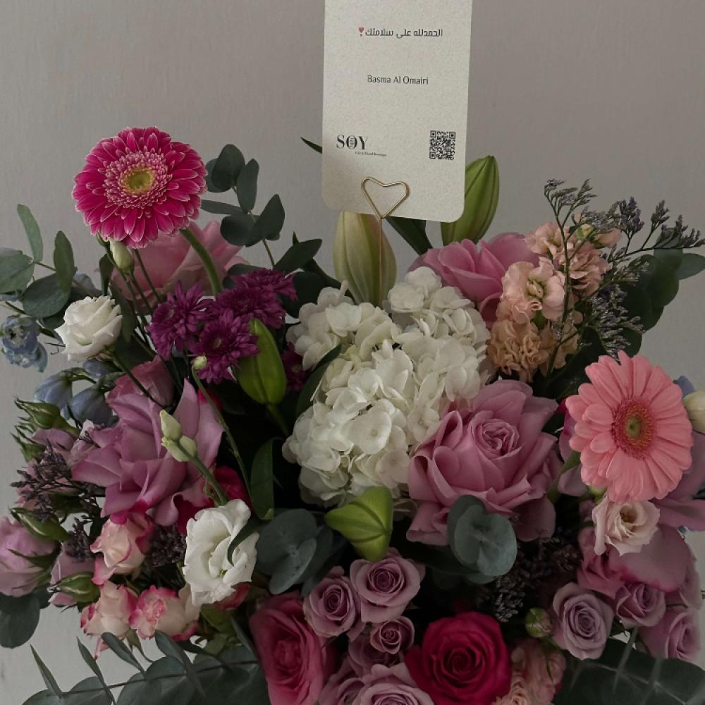 يضم باقة من أجمل الزهور الطبيعية الموسمية بدرجات البينك، البنفسجي، والأبيض بتوزيع متوازن يمنح شعوراً بالراحة والرقي.