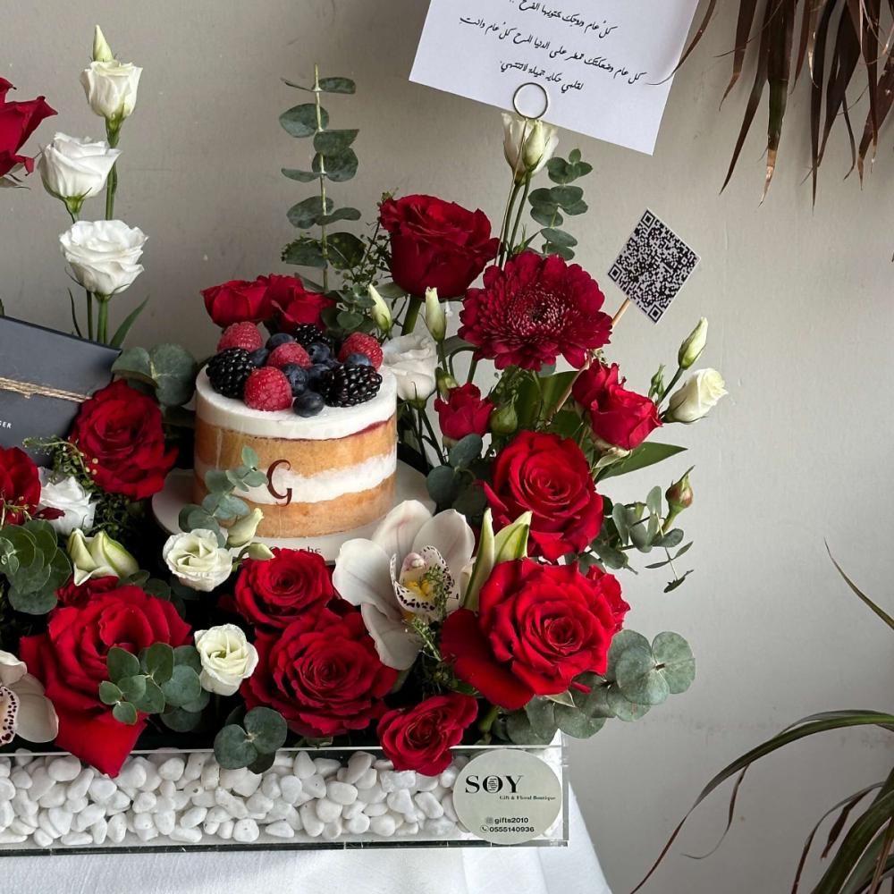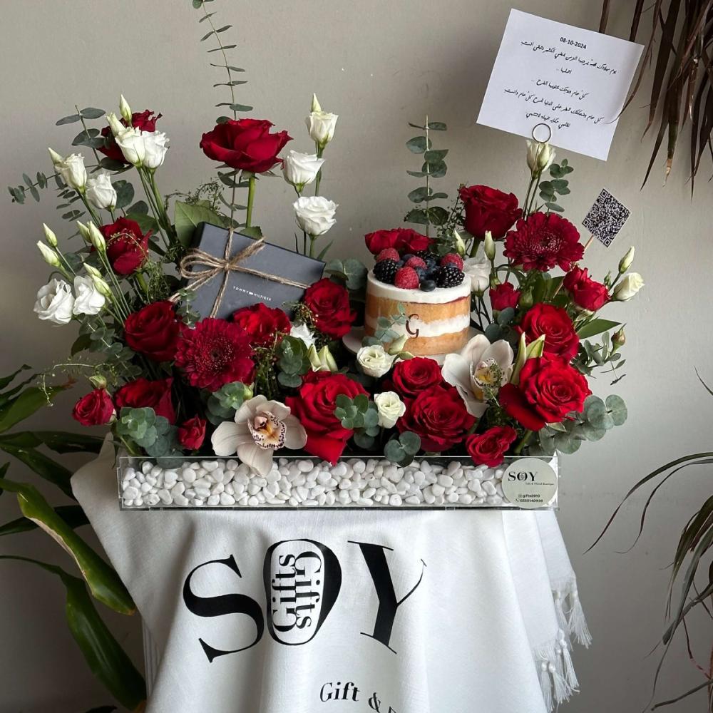 يأتي هذا التنسيق الفاخر من متجر SOY Gift & Floral Boutique ليجمع بين الجمال الطبيعي والفخامة. الورود الحمراء والبيضاء المنسقة بشكل متناغم مع الأوراق الخضراء تضفي إحساسًا بالرومانسية والأناقة. بالإضافة إلى ذلك، تأتي هذه الباقة مع كعكة صغيرة مزينة بالتوت الطازج، مثالية للمناسبات الخاصة، ومحفظة فاخره من تومي هيلفيغر تضفي لمسة من الرقي. كل هذا في وعاء مستطيل جميل مزين بحجارة بيضاء، مما يجعله خيارًا فريدًا لكل من يريد تقديم هدية تعبر عن الجمال والاهتمام.