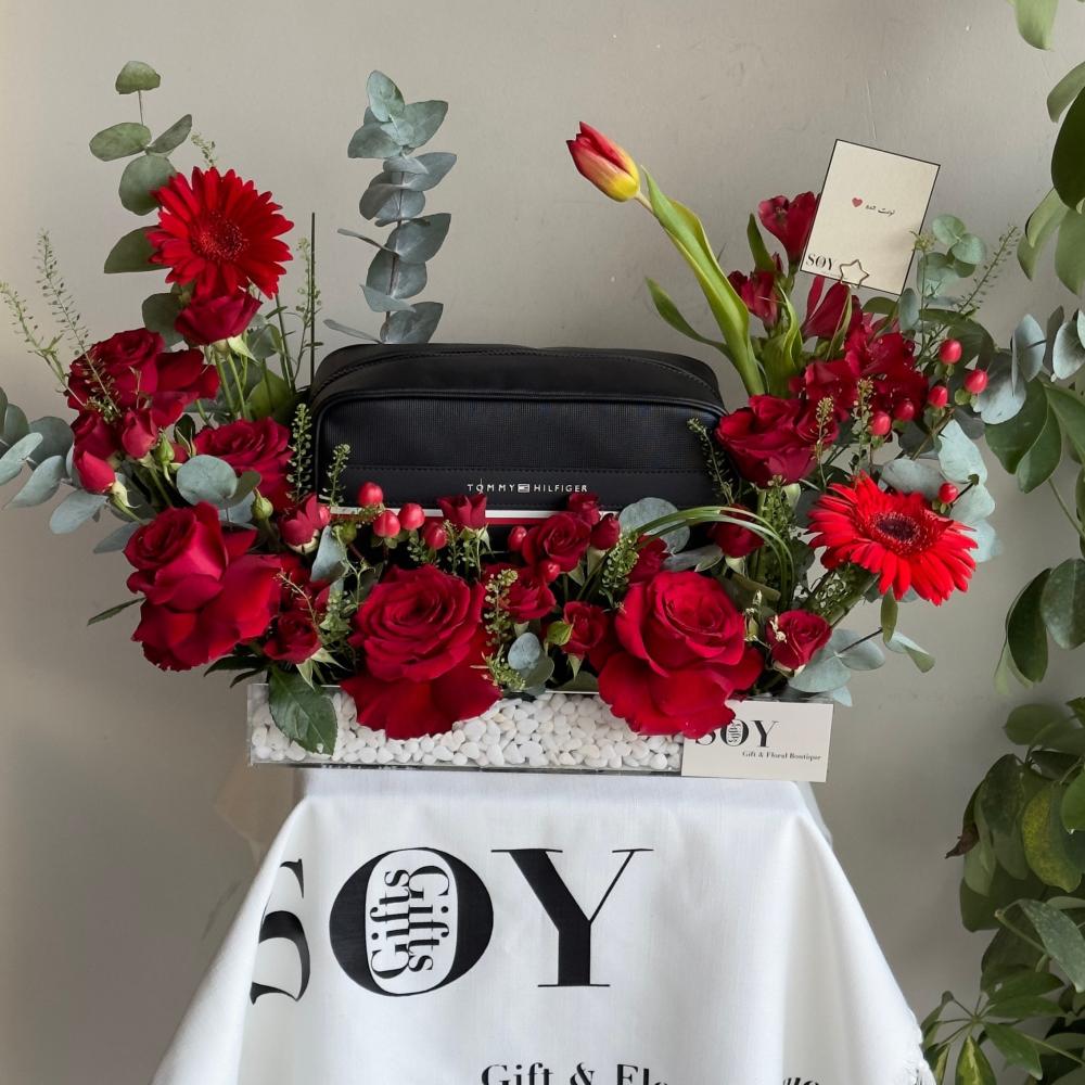 شنطة تومي مع الورد ليست مجرد حقيبة، بل هي تعبير عن الأناقة الممزوجة بالروح والجمال الطبيعي. هذه التوليفة الفريدة تأتي في صندوق مستطيل مزيّن بالورود الحمراء الساطعة وقطرات الجربيرا مع لمسات من أوراق الأوكالبتوس الخضراء، ما يضفي على المنتج لمسة من الطبيعة الراقية. برزت زهرة التوليب الحمراء الطويلة بموقعها الفريد لتضفي بُعدًا إضافيًا للترتيب وتجعل منه تجربة بصرية ساحرة.
