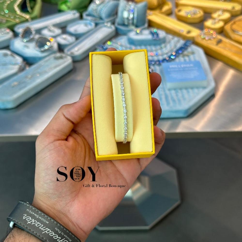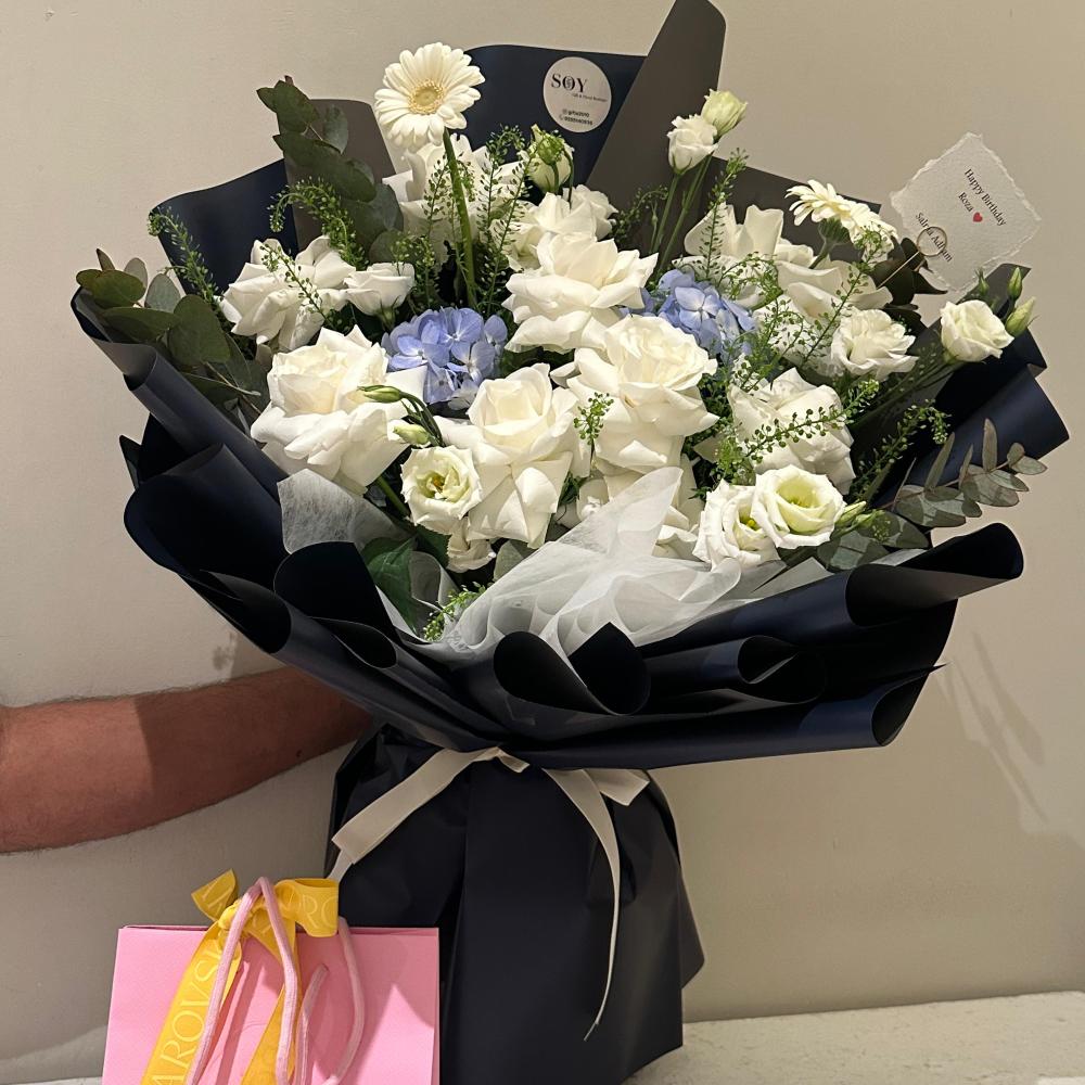باقة ورد أنيقة مكونة من زهور بيضاء وهادئة، تتألف من ورود بيضاء فاخرة مع لمسات من زهرة الجربيرا البيضاء وأزهار الهيدرانجيا الزرقاء الناعمة. تم تنسيق الباقة في ورق تغليف فاخر باللون الكحلي الداكن مع شريط أبيض، مما يمنحها مظهرًا عصريًا وأنيقًا. هذه الباقة مثالية للاحتفال بالمناسبات الخاصة مثل التخرج أو الذكرى السنوية أو هدايا العمل. تأتي مع حقيبة هدية صغيرة أنيقة تضيف لمسة راقية إلى الباقة.